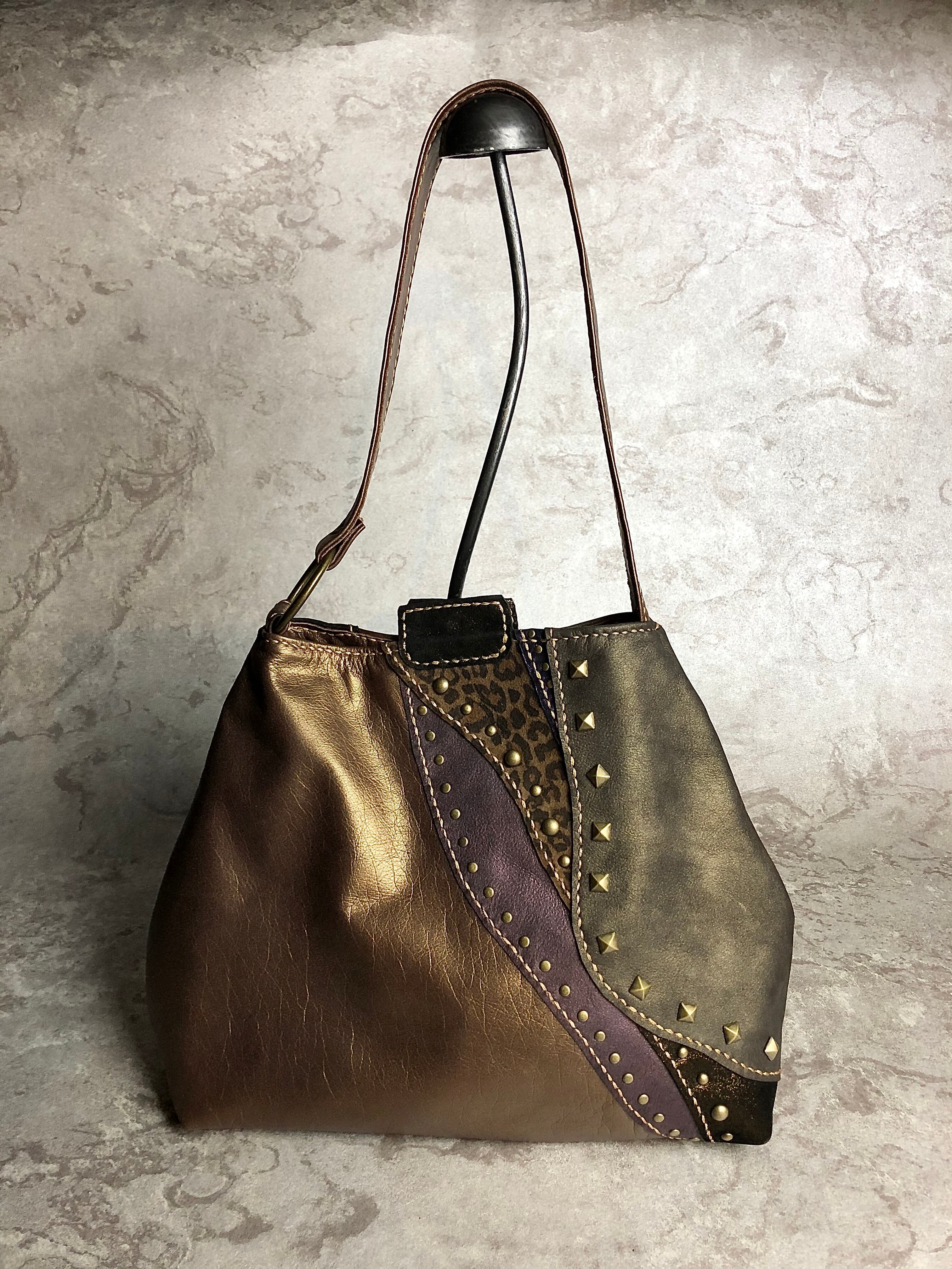 しっかりと入る大振りのバッグです。コーディネートしやすいブロンズカラーのベースにメタリックな革のパッチワークとスタッズのアクセントが効いたお洒落感のあるお品です。